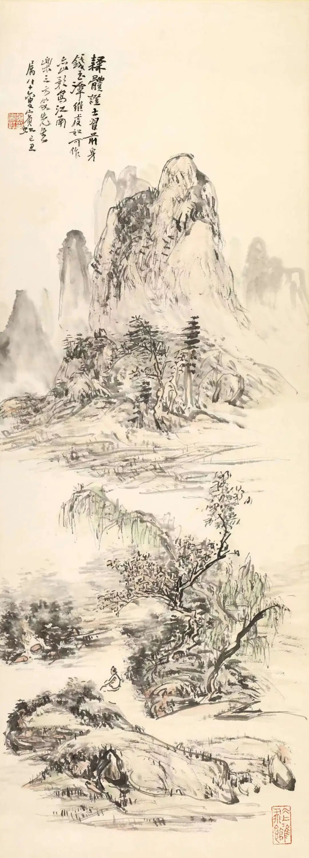 黄宾虹学习的对象从清代陈若木、扬州八怪等上溯至清四僧、明四家、董其昌、新安诸家、赵孟頫、元四家,直至北宋关仝、范宽、郭熙,五代荆浩、董源、巨然几代山水画大师。黄宾虹曾言“画不师古,未有能成家者”,将“师古”看作学习的手段和过程。黄宾虹的师法对象既不限于“南北宗”,也不限于”四王”“四僧”,而是以“博观而约取、厚积而薄发”的方式贯通整个山水画史,尤为难得的是他以“笔墨理法”作为剖析古人、打通画史,并将其回溯到取象成图的中国艺术的源头,上升到中华民族文化精神根源性的探求。