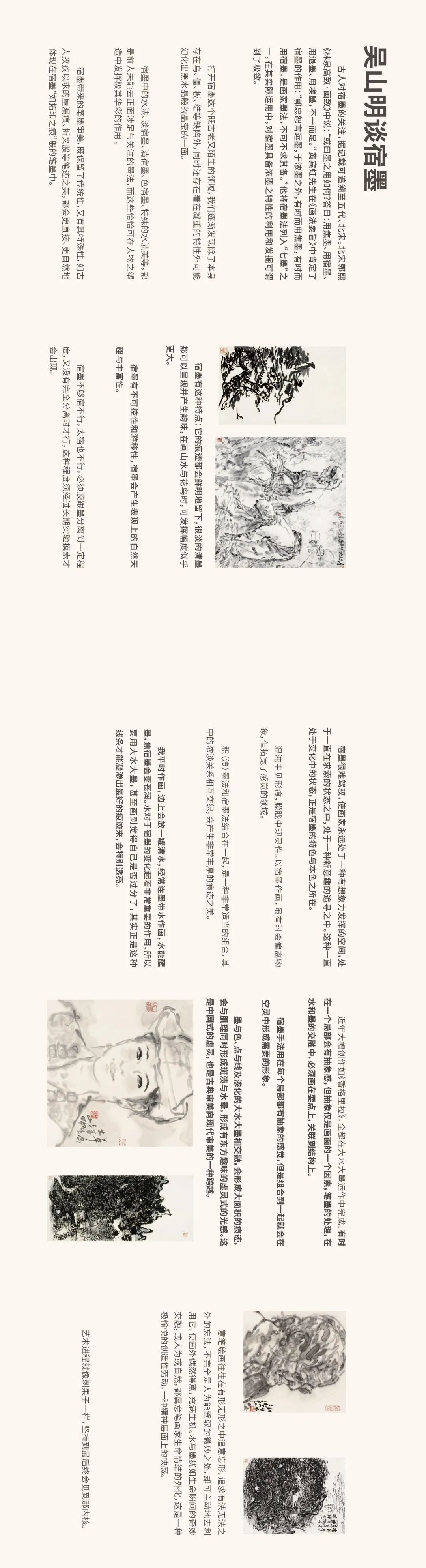 展览分“笔墨乾坤”和“学泽艺韵”两大主题版块。“笔墨乾坤”板块从“师法古人”“自出机杼”“学脉流芳”三个方面阐述了黄宾虹师法古人、师法造化,从中国画内部寻求突破,终于创造出自己浑厚华滋、凝重高古的独特画风,并影响了杭州国立艺专一大批师生,充分肯定了黄宾虹是二十世纪中国画承上启下、向现代转型的重要奠基人。“学泽艺韵”板块包括“黄宾虹研究的先行者赵志钧”“‘黄学’研究的打石工王中秀”“向黄宾虹致敬”三部分内容,赵志钧和王中秀是黄宾虹艺术的研究者、传播者和捍卫者,“向黄宾虹致敬”则是吴山明通过深研笔墨、承续传统,与大师黄宾虹对话。