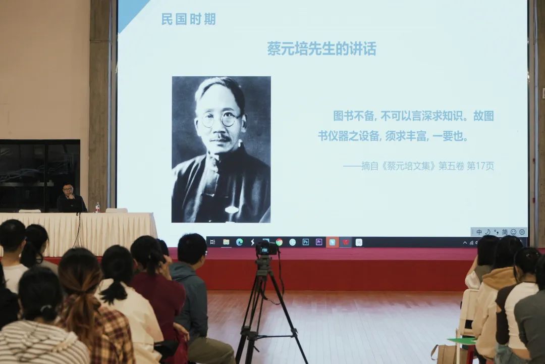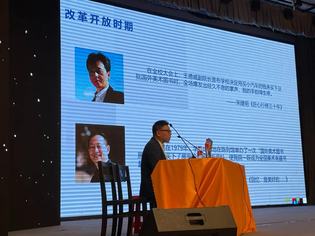历史积淀深厚、馆藏资源丰富、学术特色优异是学校图书馆十分鲜明的特征。兰老师从馆藏资源、馆区分布切入,着重阐述了图书馆近百年的历史沿革。他以蔡元培先生“深求知识”“须求丰富”图书建设要求,引入各个时期的馆藏章、校友眼中的图书馆、珍贵馆藏图书等多个角度,结合丰富的图片和详实的史料,向同学们展示了图书馆的学术文脉发展历程——与学院同龄、是学院共同体。而那场改革开放时期图书馆举办的“外国美术图书展”,对一代青年躁动的激情青春,似乎仍久久温存在校园的空气中。熟悉掌故,善讲故事,在兰老师的生动讲述中,同学们也被带入这段历史,心潮澎湃。