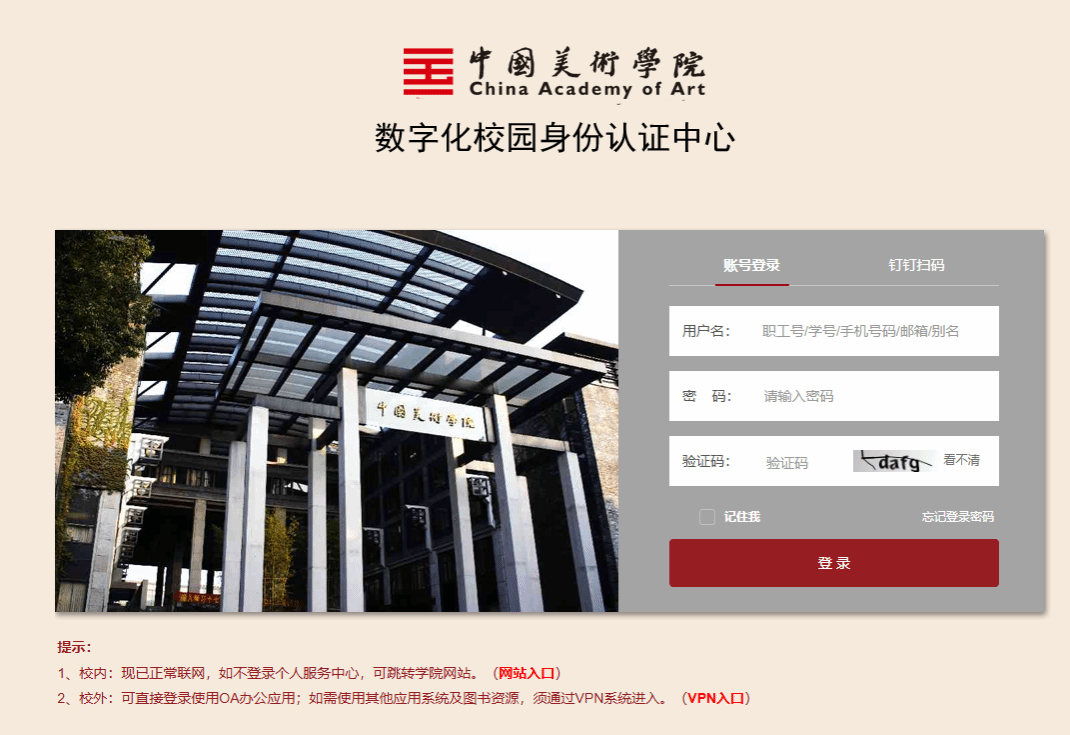 使用用户名和密码登录“中国美术学院数字化校园身份认证中心”,教工的用户名是工号,学生的用户名是学号。