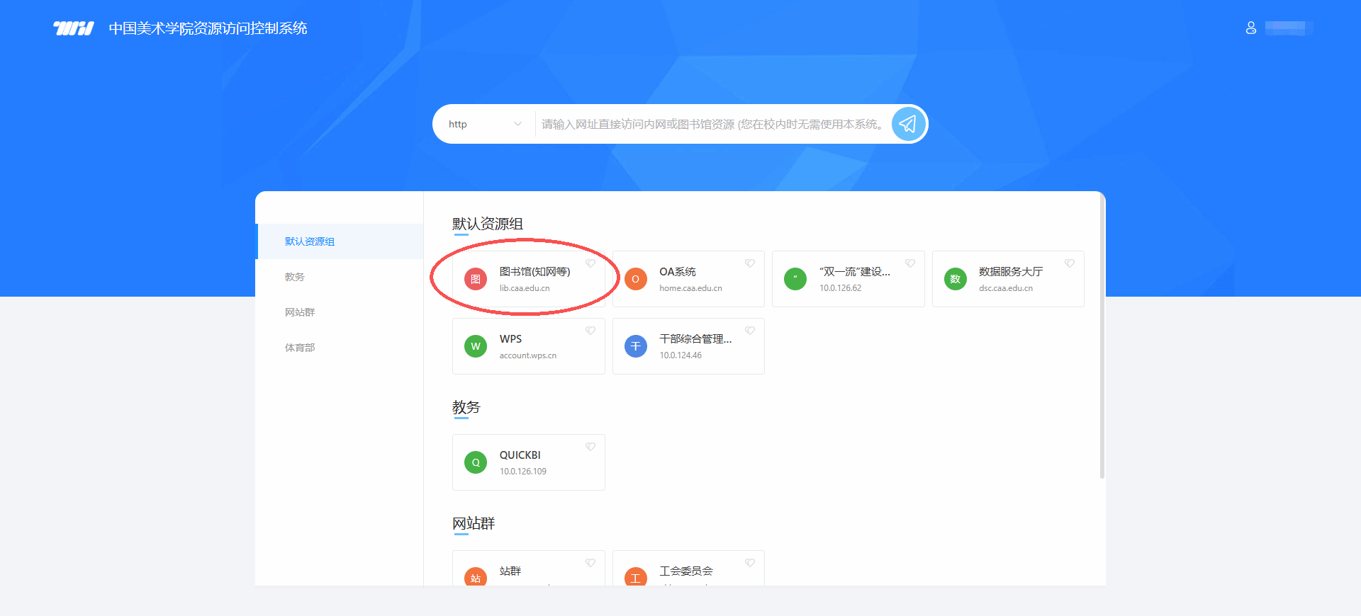 椭圆形红圈中为图书馆主页的链接地址,点击后可以进入图书馆主页,使用图书馆购买的各种数字资源。